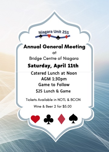 All ACBL Members in the Niagara Area are invited to attend our Eighth Annual General Meeting for the Niagara Area, Unit 255 on Saturday, April 11, 2026, 1:30 pm