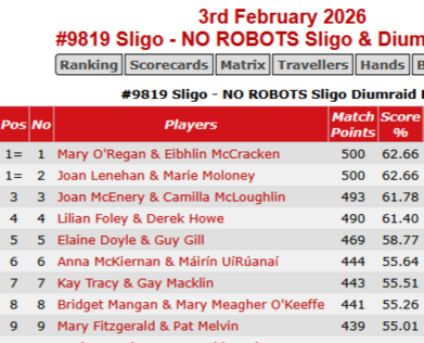 Great to see our members Mary and Eibhlin take the honours online from a total field of 40 pairs.