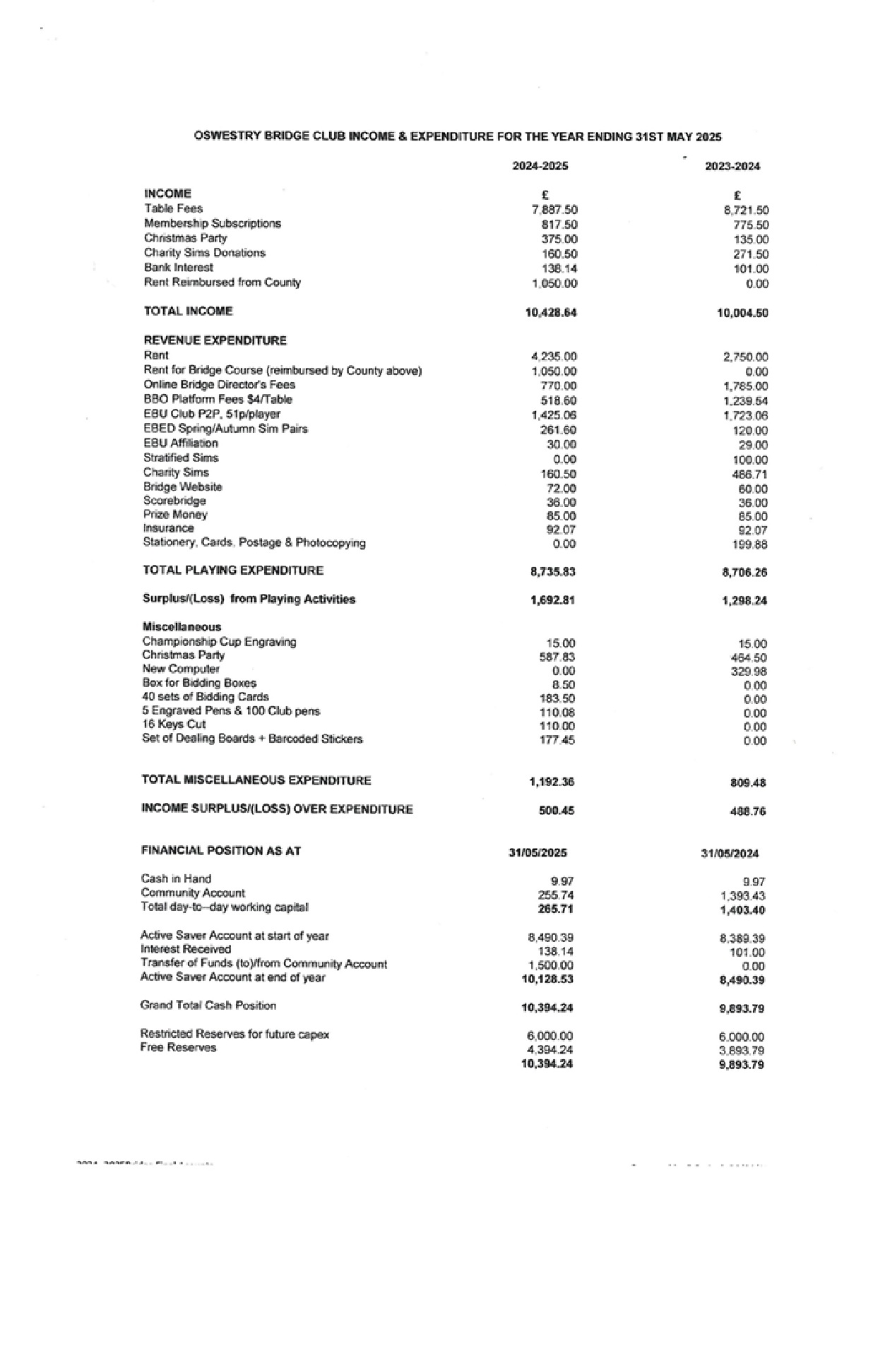 expenditure was 40 sets of bidding cards and 2 sets of dealing boards as some of the