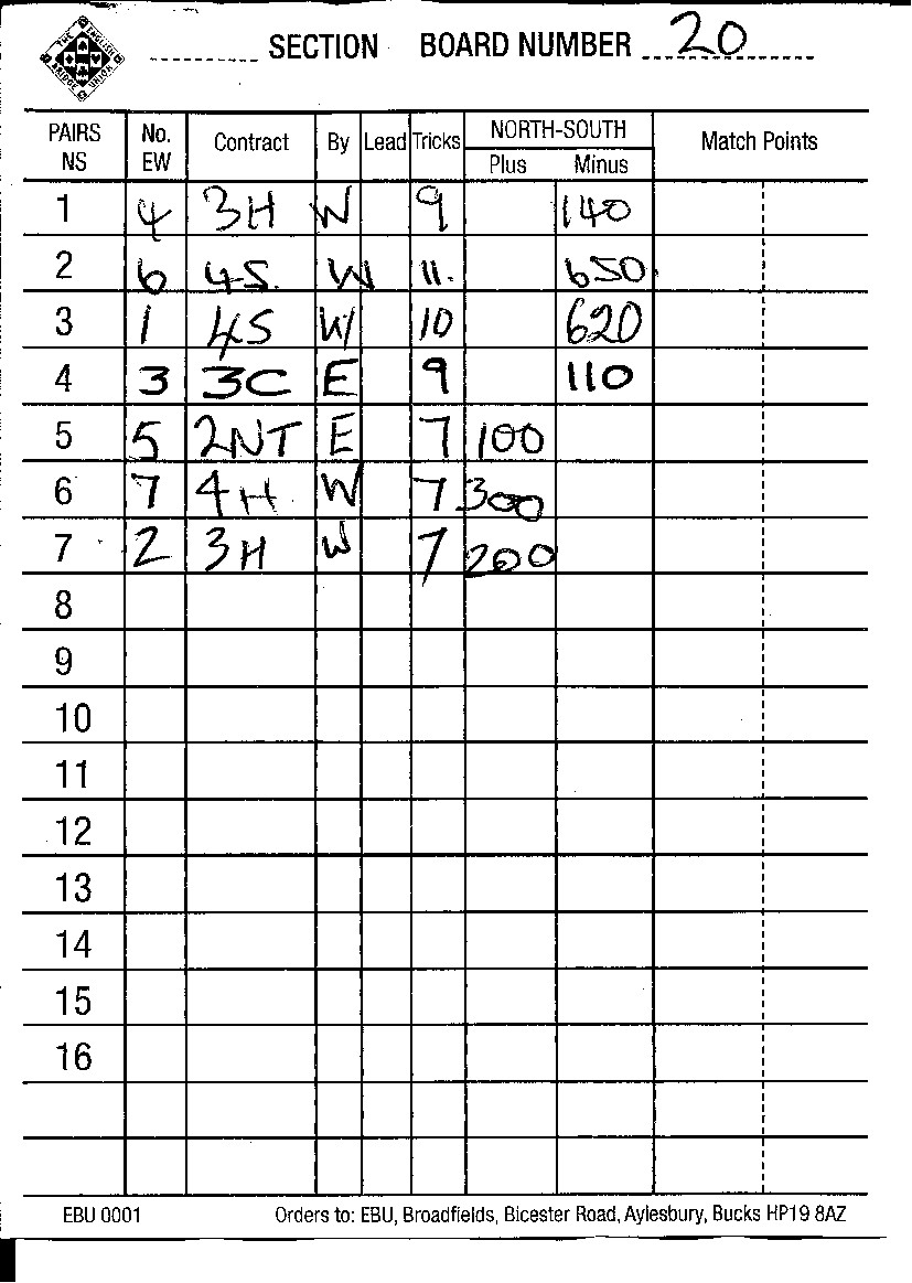 Note 2: Writing in the score is the LEAST important thing to do as our scoring software automatically puts in the score after the other info is input (contract/played by/number of tricks made).
