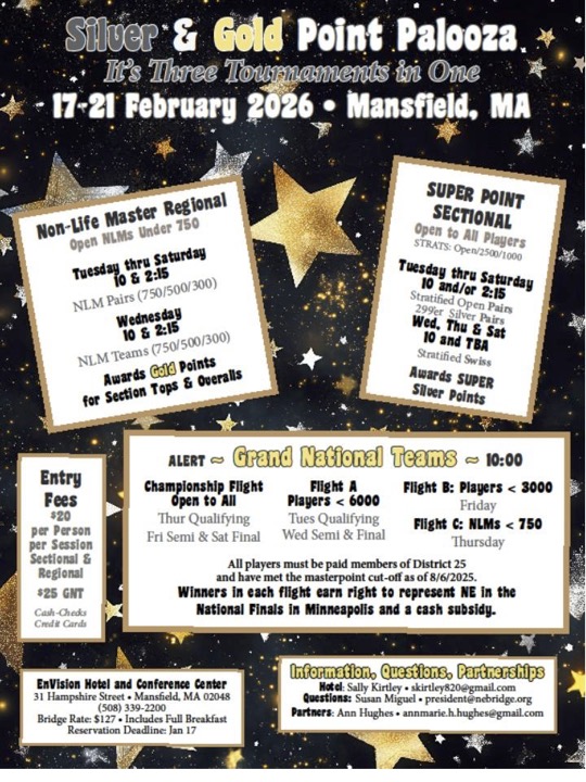 ACBL has published their 2026 schedule, so we can now begin to fill out our club's schedule of special games for the upcoming year. This will be done shortly. Special games will begin to appear on the right side of the home page of our club website, so keep an eye out for opportunities to win enhanced masterpoints, both in amount and pigments. The first of these will be a D25-wide STaC game (all silver points) in early January.