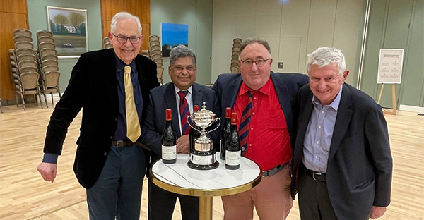 An early start of 3.30pm in the Stewart Room allowed players to finish dinner mid-evening and was appreciated by those with a distance to travel. It was an enjoyable match with the home team actually leading by 20 imps at the midway point but, as we all know, a slip here, a clever bit of play there and a swing of 22 imps can readily result, as it did that night. Both sides are already looking forward to a rematch in 2027.