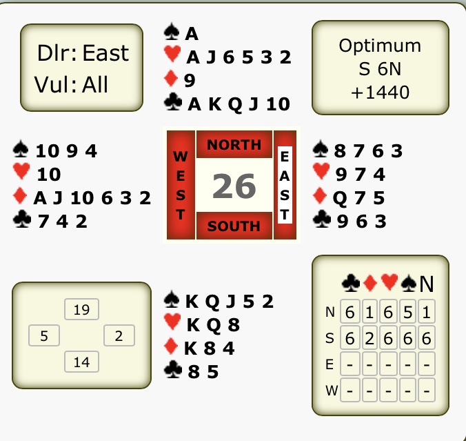 But my frustration turned to delight on a subsequent hand… I picked up 17HCP, and partner opened 1NT…. gulp! Deep breaths… slowly now. Where might this go? We proceeded slowly (as one should with big hands). I was concerned that partner might drop me before game, but I engineered some forcing bids just to see what she might have. All seemed worth a punt… we had minimum 32HCP, plus I had some decent shape (5431). 4NT… partner bids 5S: but I was staring at the Q of the last bid suit… aha, don’t forget that partner does standard Blackwood… how many aces? 3: I had the other and 2 kings. To get to her 15HCP minimum we were perhaps missing a K.
