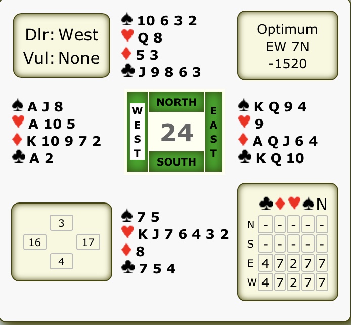 On sober reflection, I should have checked Ks with partner, but with all the As and decent shape I decided it was worth the risk… life in hands… 7NT. I have never bid that before, but there’s a first time for everything.