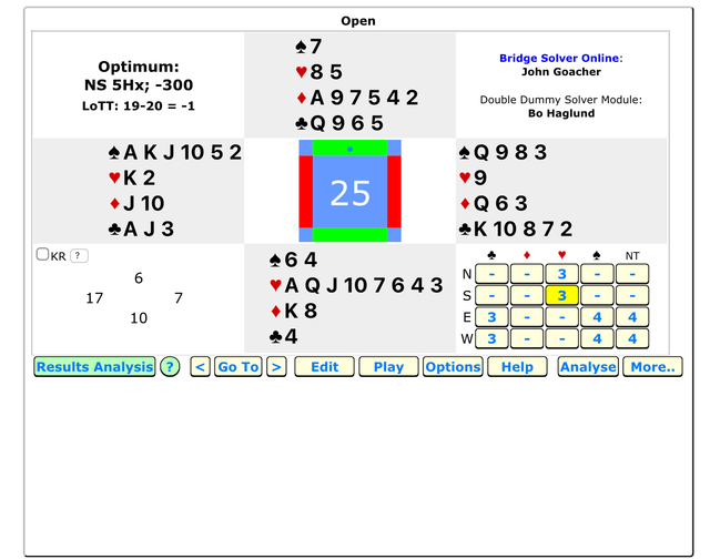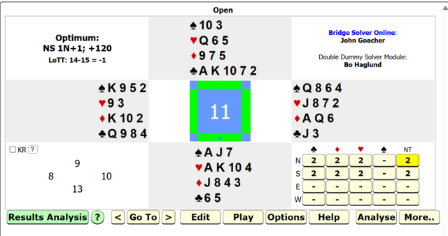 First about "the guess" at trick 1. Look at the "Play it Again " tab; select 3NT by West. All leads show EW take at least 9 (the subscripts of 4 show at this point the best NS can do is take 4 tricks. Now select a low spade and the view changes to dummy. Here is the surprise! The Queen has a subscript of 8 IF the Q is played EW are headed to down 1 absent further errors by NS in play.
