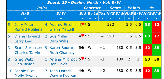 There is lots of room for "Partnership Understanding" here. I held the East hand and certainly the case can be made for a call of 3♦ rather than 2♦ . But I favor "New Suit Forcing" by an unpassed hand, which brings us to West. What to do?? The hand is tailor made for the "Impossible Spade." The first bid by West of 1NT denies a four card spade suit, period. Thus, a bid now of 2♠ can be used to show maximum values and a raise in Diamonds. The treatment is referred to as the Impossible Spade. Of course, it seldom if ever comes up, but it did 9/11/25, Hand 25. |
