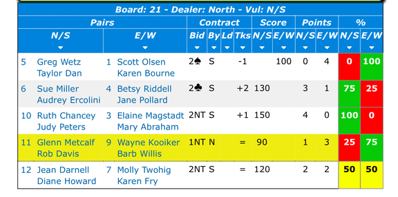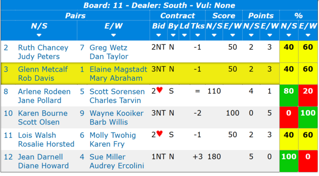 So how did we get to 7NT? By mistake. Rob held Qxxx in Diamonds and Jxxxxx in Cubs and doubletons in both majors. He decided after my 2 Club open to bid 3NT. We play 2 Hearts as a bust. (no Ace, no King.) While I could not imagine what he had except he must have the K of spades. So I dropped the 7NT card. After the lead (not a spade) I laid out the dummy on the table. At trick 12 he hooked the spade making 7. |
