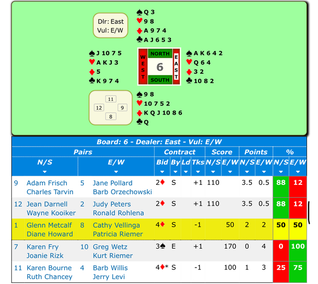 In the auction as shown E/W missed an opportunity for a free double.. When North makes the 4♦ call there will be one of two outcomes N/S are either making their contract or N/S are going down.. Well true on every final contract you might say either it makes or it does not. However on this well bid auction by both sides E/W should know one more thing if N/S can make their bid E/W are getting a bad board. Likely if the contract makes 4♦ a zero is in the works for E/W.. So now the only thing foe E/W to do is double.. If it makes it makes a zero by any amount is exactly the same but if the contract is doubled and goes down the double in all likelihood will improve the outcome. Traveler maybe found in the Answer tab.