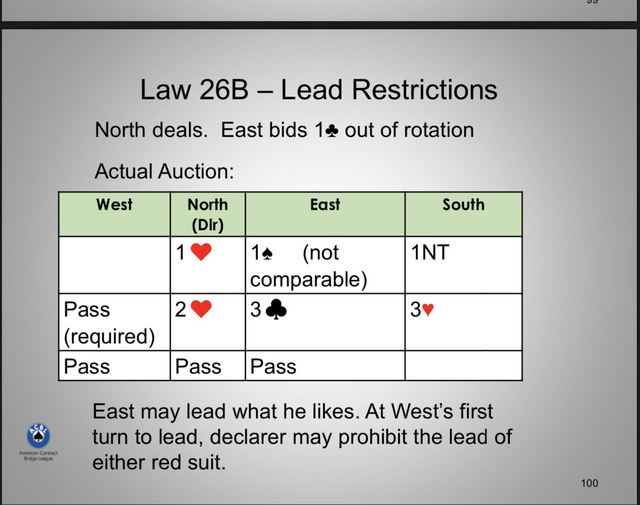 Here is an example: After a call is replaced by a non compatible call then lead penalties may occur. When offender’s partner is first on lead, declarer may prohibit the partner from leading any (one) suit not specified by the offender in the legal auction. The following example is from Director training materials: