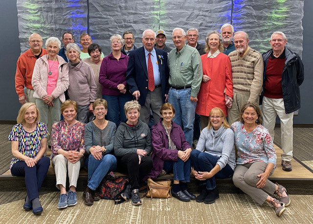 Jim, front and center, at his 90th birthday party in 2021 with the bridge players who were able to attend.