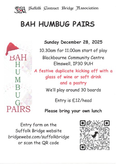 The event was won by Alaric & Dorothy - click CAFE to see the message on the Suffolk Bridge website - who also won the Autumn Festival Pairs on September 7. Very well done!