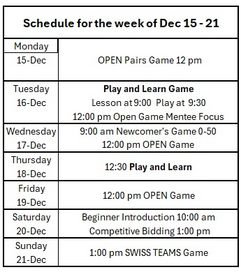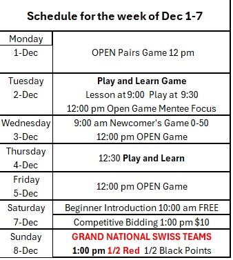 Swiss Team game every Sunday at 1:00. Pam is delighted to find partners and teammates. Call 201.247.1595