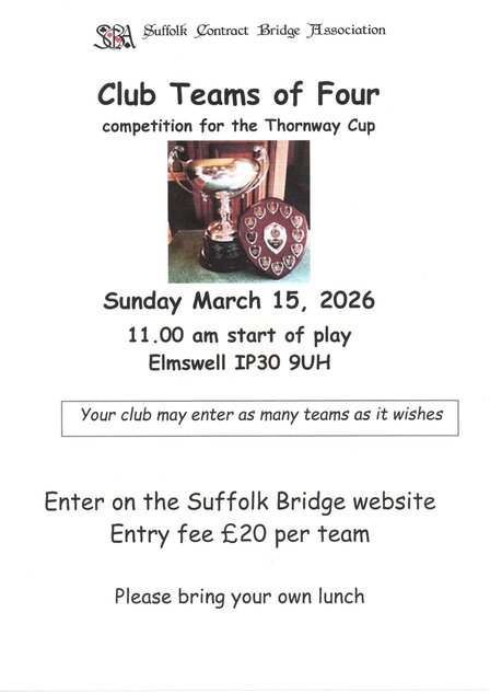 If you wish to enter, please complete the entry form - click HERE to see it. The entry fee for the Qualifying event is just £5/pair and Suffolk Bridge will pay the entry fee for the May 30 Final.