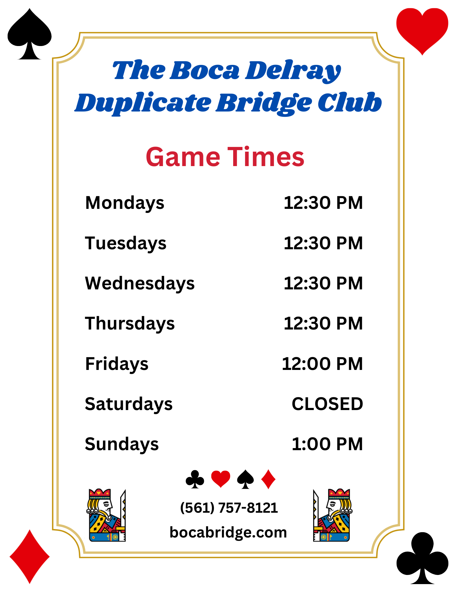 Welcome to the Boca Delray Duplicate Bridge Club, located at 2475 West Atlantic Avenue. Our game is held Mondays through Thursdays, starting at 12:30 pm, Fridays, starting at 12:00 pm and Sundays, starting at 1:00 pm.