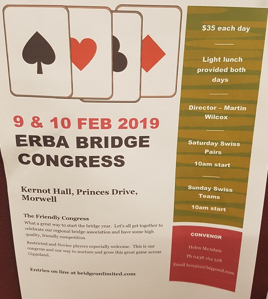Our 6th Annual Congress will be held at Kernot Hall, Princes Drive, Morwell on the 18th and 19 August 2018. We are very excited to be able to use this great venue to welcome players from across Gippsland and beyond. Please note the new venue and look out for the Bridge Congress signs as you drive into the Federation Tafe/Kernot Hall complex.