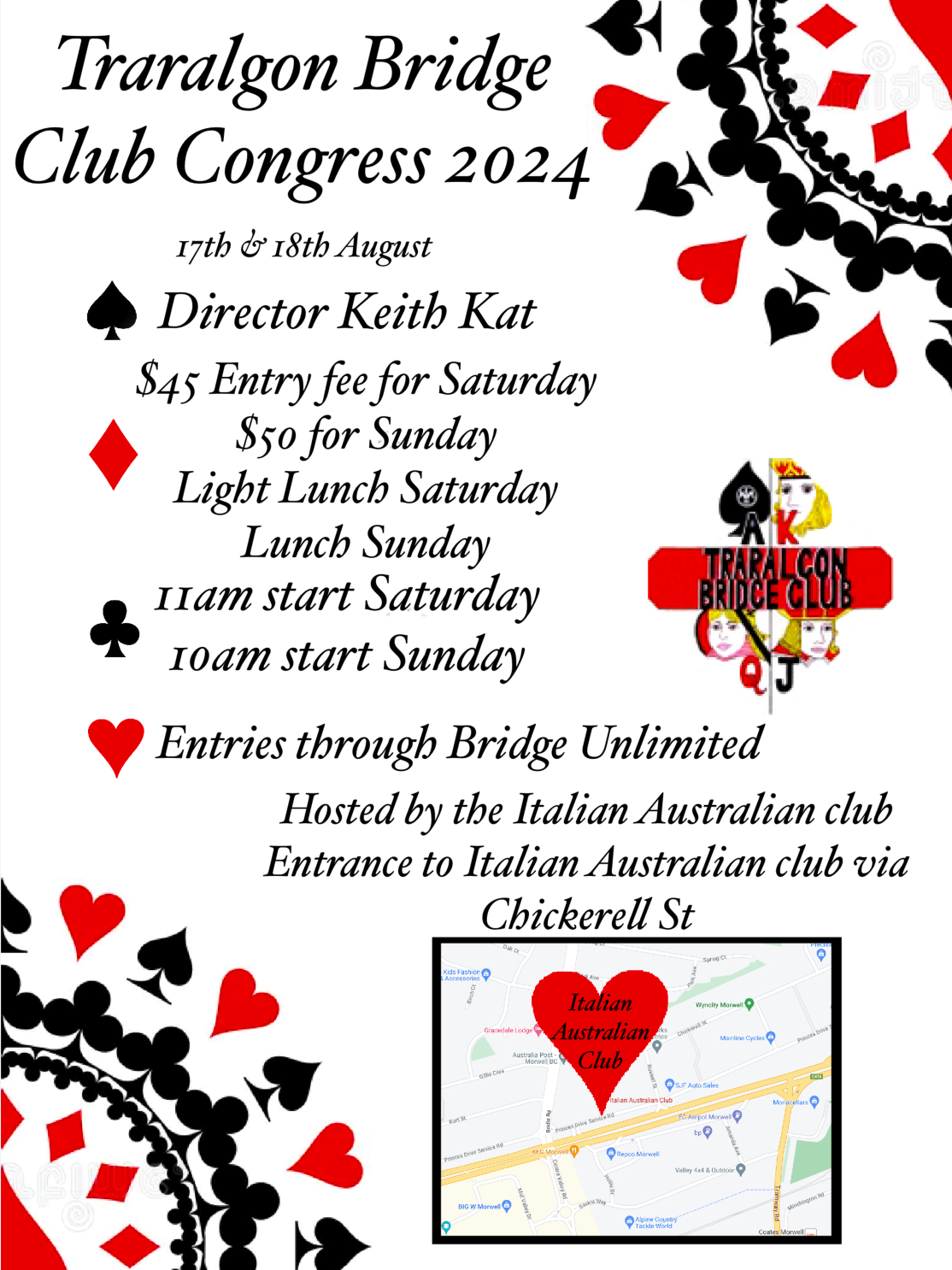 The Congress was run at the Italian Australian Club in Morwell, which proved to be an excellent venue. The event was directed by Keith Katt, a qualified bridge director based at Mirboo North.