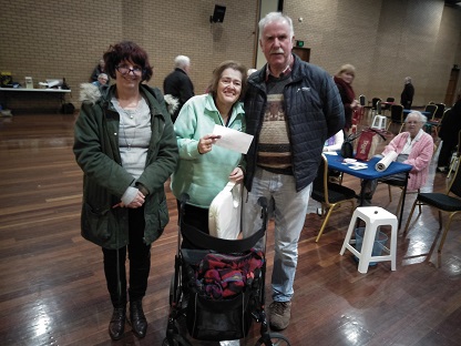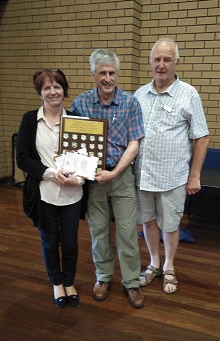 Winners of the Swiss Pairs Mary and Steve Colling receive their prize from Greg Nicholson (President, Traralgon Bridge Club), with Keith Katt (Congress Director) at right.