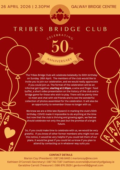Please be advised that the A.G.M. of The Tribes Bridge Club will take place on 23rd October 2025 in the Galway Bridge Centre at 7.15 pm.