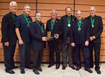 Joukkuekilpailun hopeamitalistit Vesa Leskelä, Matti Sihvola, Seppo Castren ja Joakim Fabritius juhlaillallisella.