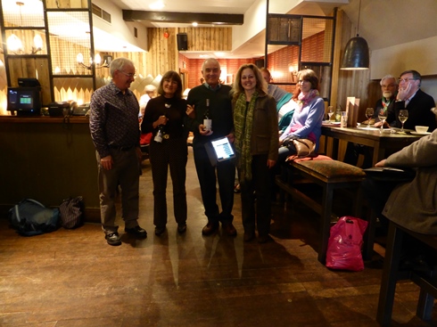 We all met at Couture, part of the Contemporary Art Gallery, for a welcome and introduction, before moving to one of the venues, Dino's, All Bar One, Missoula, Couture or Jamie's Italian. After the first set of 6 boards, we rotate to another venue, where we play a second set, then have lunch. Three more rotations, and then all gather at Jamie's for a glass of wine and a raffle, while the scoring was finalised, using BriAn electronic scoring. The result was soon on the website (click this link), and prizes awarded, for each of four sections.