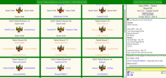 We play on Tuesday 10-30am Bridge, in Social room, finishing at around 12-30pm. We now tend to use the AV chat in BCL Social whilst playing, and use a Social table for AV chat after the session.
